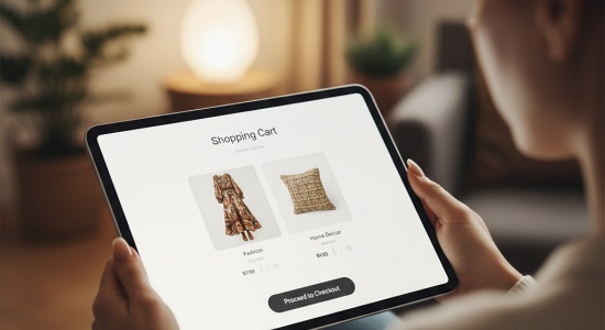 [Image of a digital shopping cart interface on a tablet screen showing a mix of items: a trendy dress next to a modern table lamp, symbolizing the «Hybrid Catalog»]